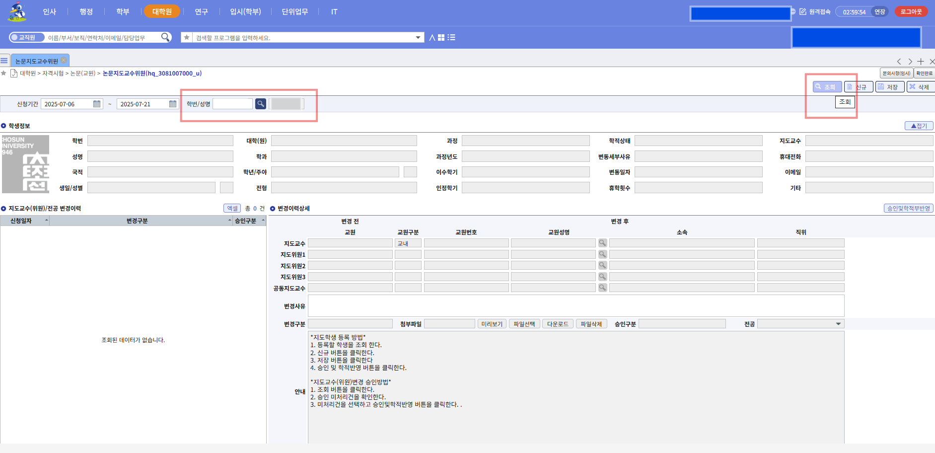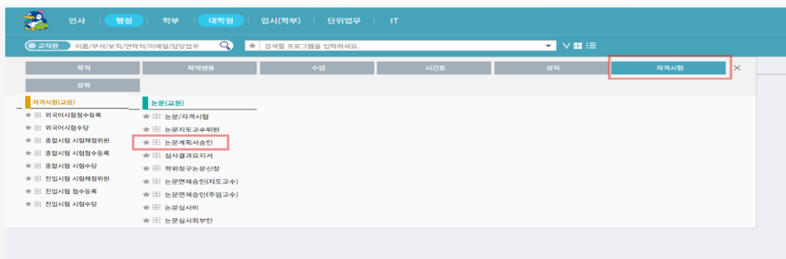 - 논문 지도교수는 차세대포털시스템에서 자격시험→ 논문(교원) → 논문계획서승인