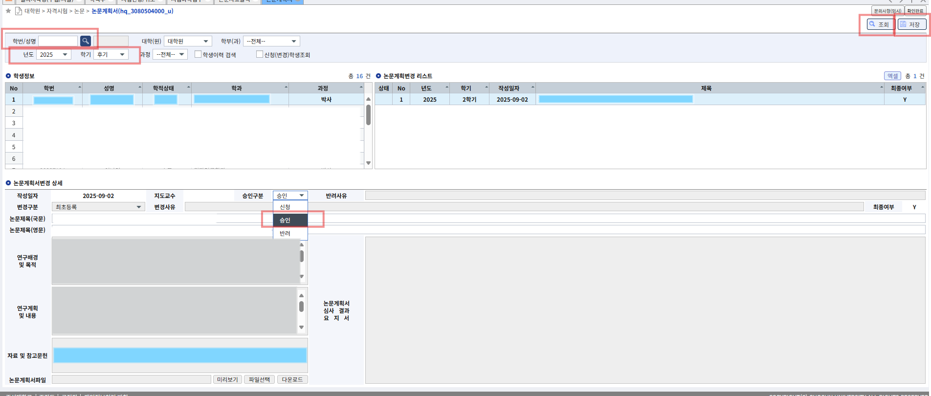 -> 입력한 논문계획서를 승인구분 [승인]->