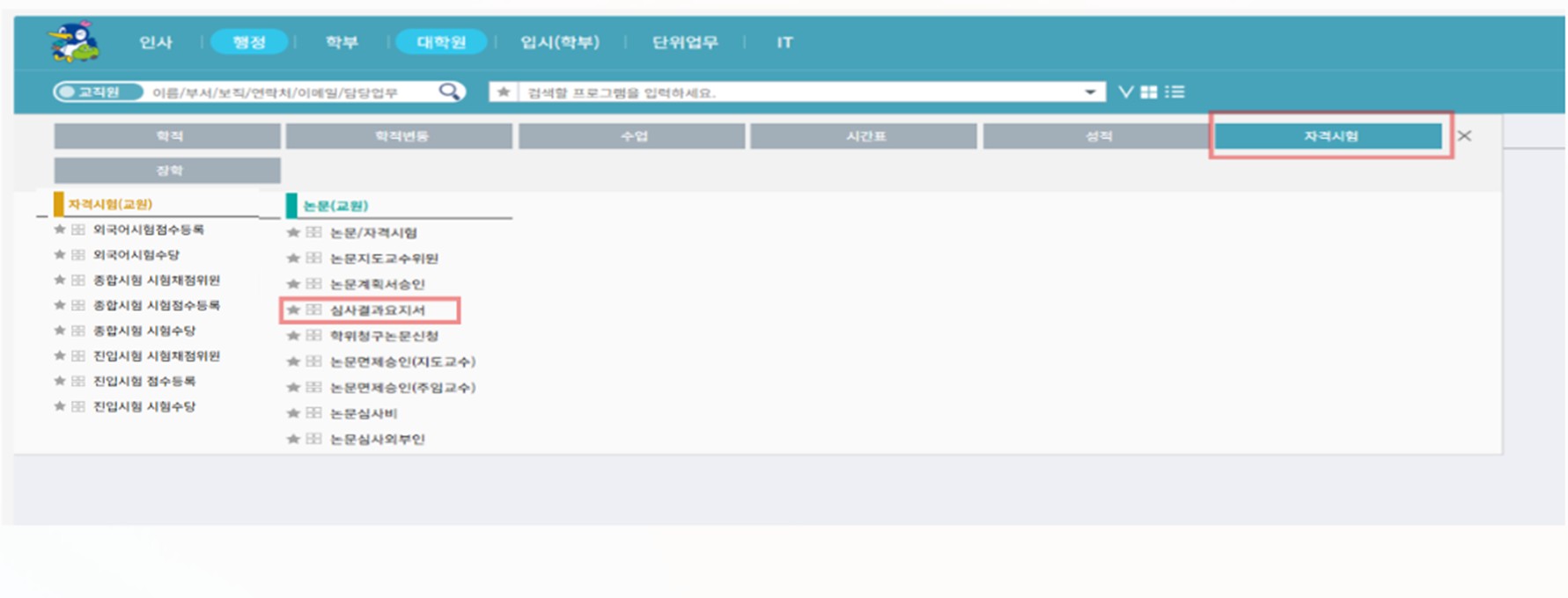 : 논문지도교수의 차세대포털시스템 → 종합정보 → 대학원 → 자격시험