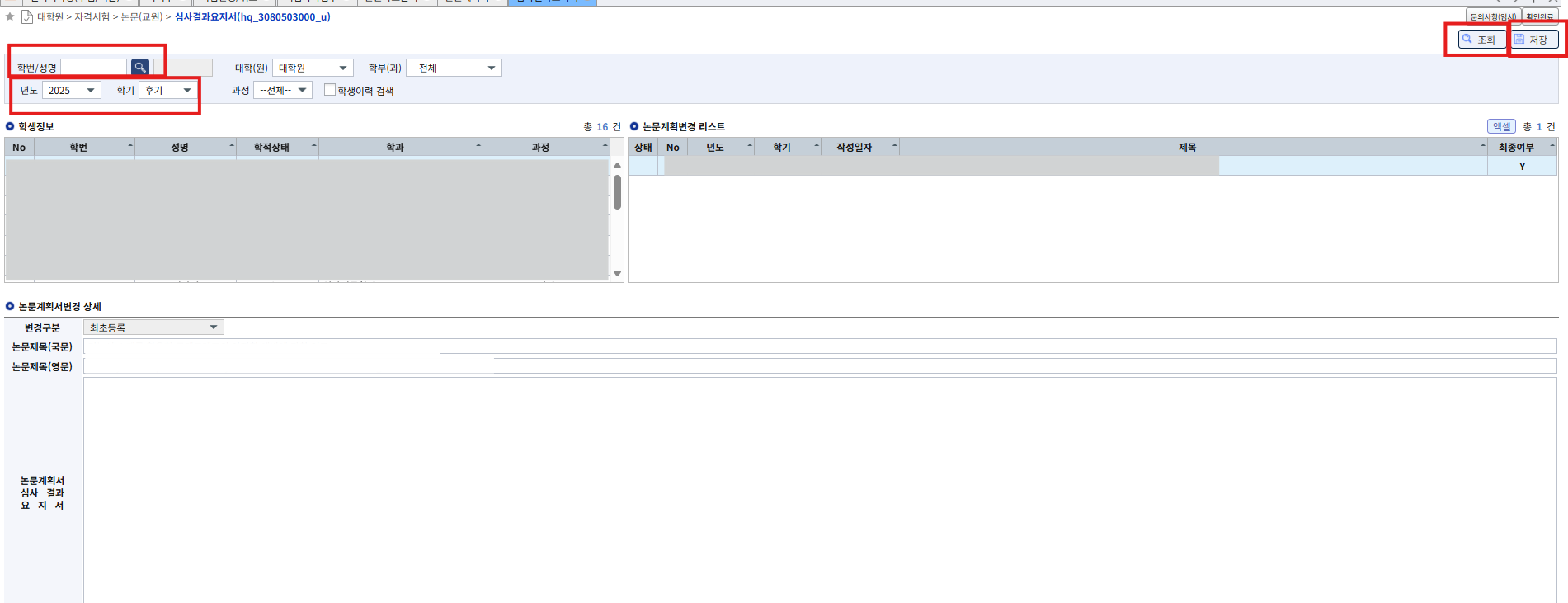 입력한 논문계획서의 심사결과요지서 작성 -> 저장